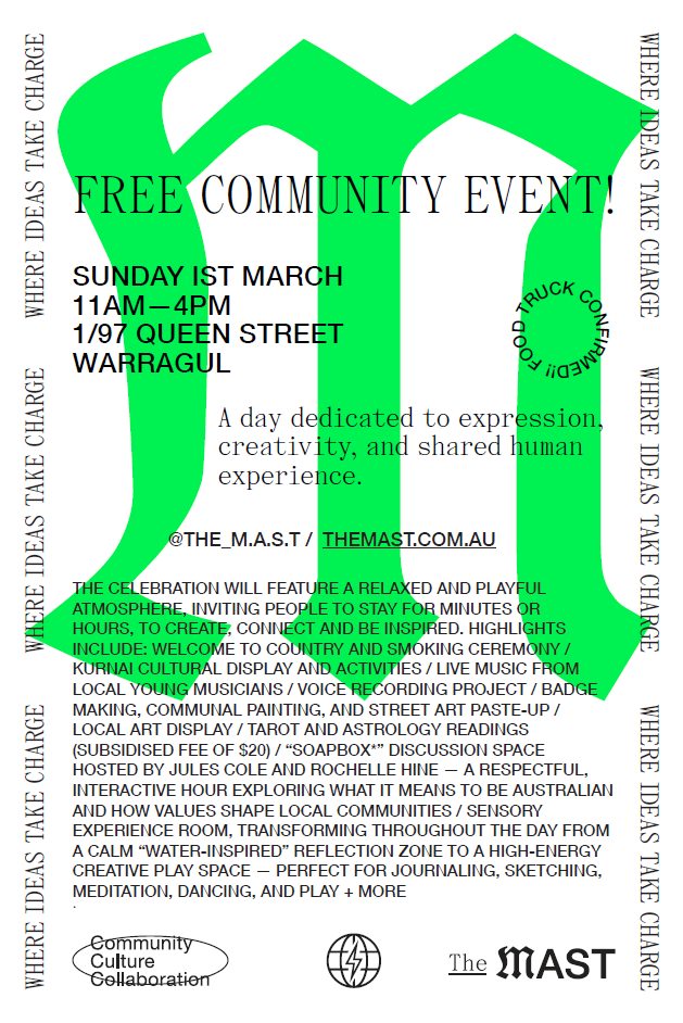 Running from 11am to 4pm, the event will transform The MAST’s beautiful Queen Street building into a vibrant hub of art, music, and cultural exchange — a day dedicated to expression, creativity, and shared human experience.The celebration will feature a relaxed and playful atmosphere, inviting people to stay for minutes or hours, to create, connect and be inspired. Highlights include: Welcome to Country and Smoking Ceremony, Kurnai Cultural Display and Activities, Live music from local young musicians, Voice recording project, Badge making, communal painting, and street art paste-up.