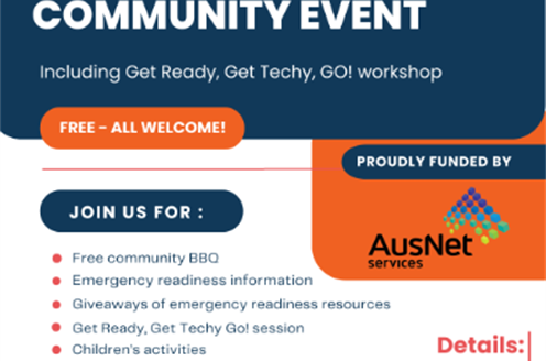 Join us for a free community dinner on Saturday, 18 April from 6.00pm - 8.00pm at the Thorpdale Hall. Enjoy emergency readiness workshops, giveaways, displays by AusNet, local emergency services units, and children's activities.