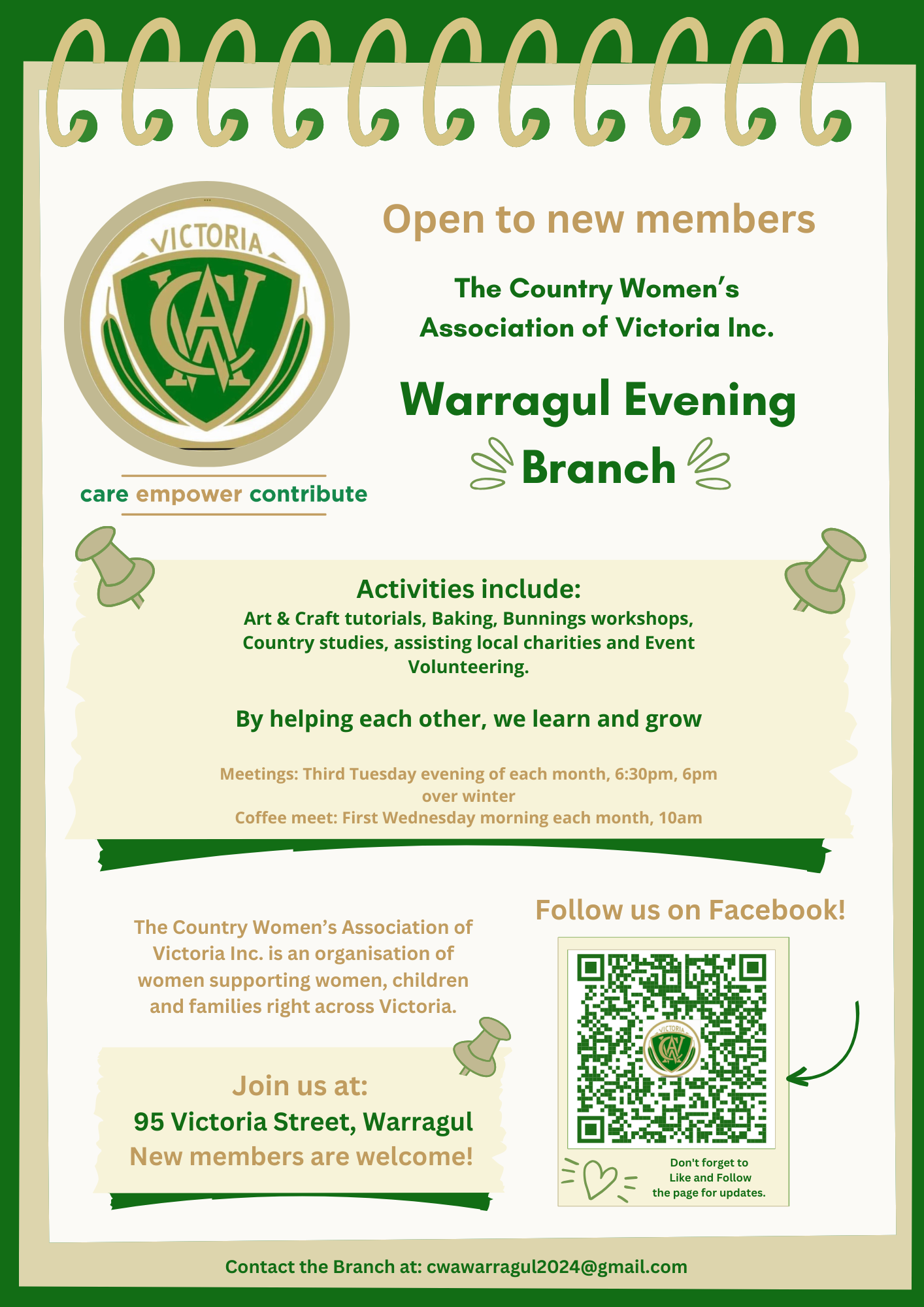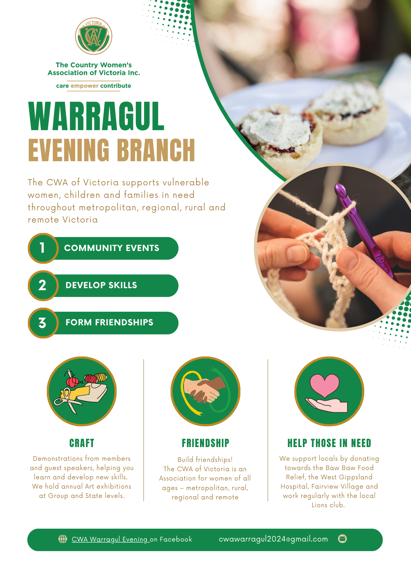 We hold casual coffee and craft mornings on the first Wednesday of each month at 10am. July, September and November these will be held at the Warragul Bunnings.